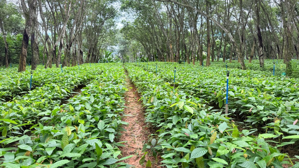 ⼩象可可千亩园区采⽤林下模式,让可可树与胶林共⽣,营造⾃然⽣态的肌理,促进⽣态多样。